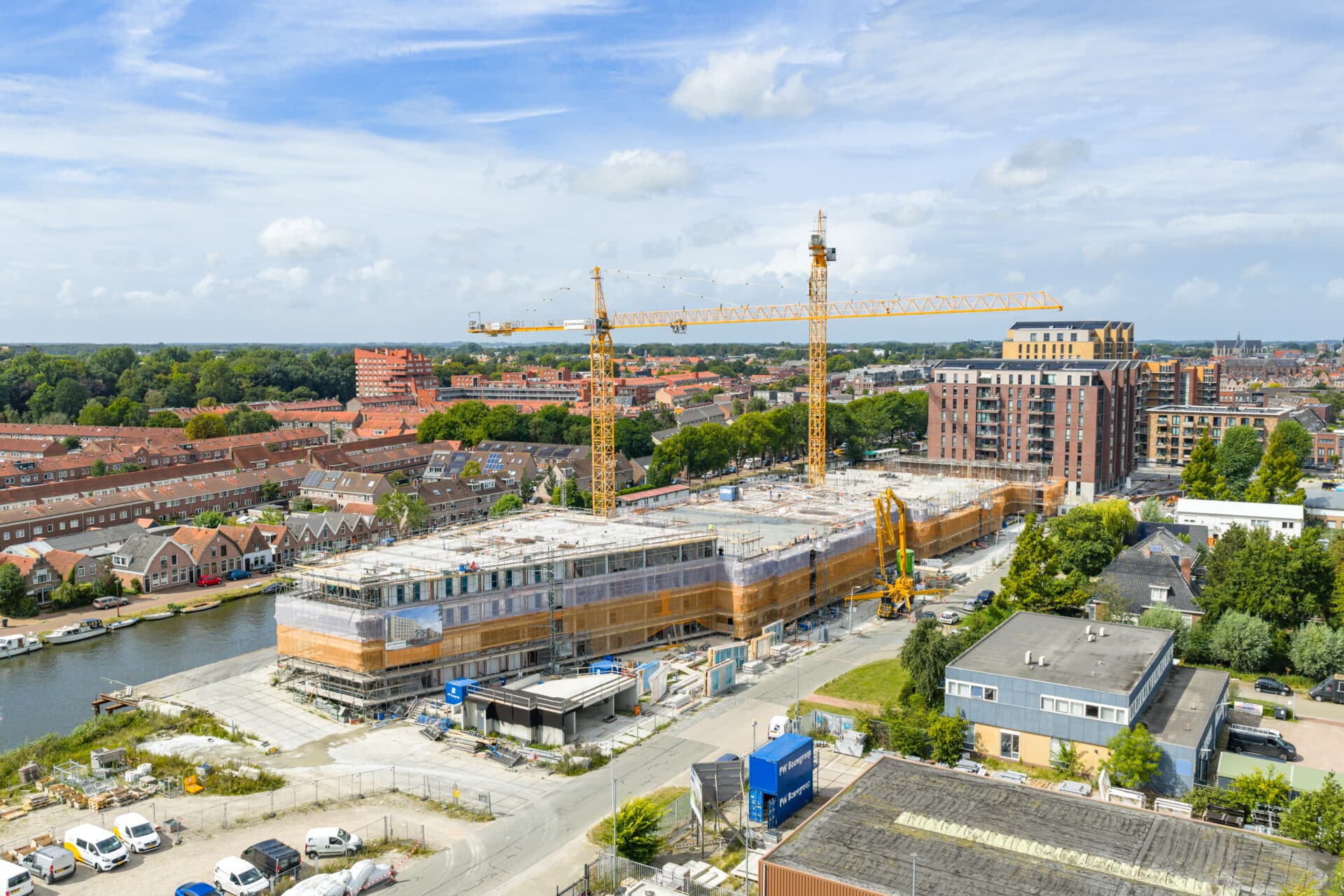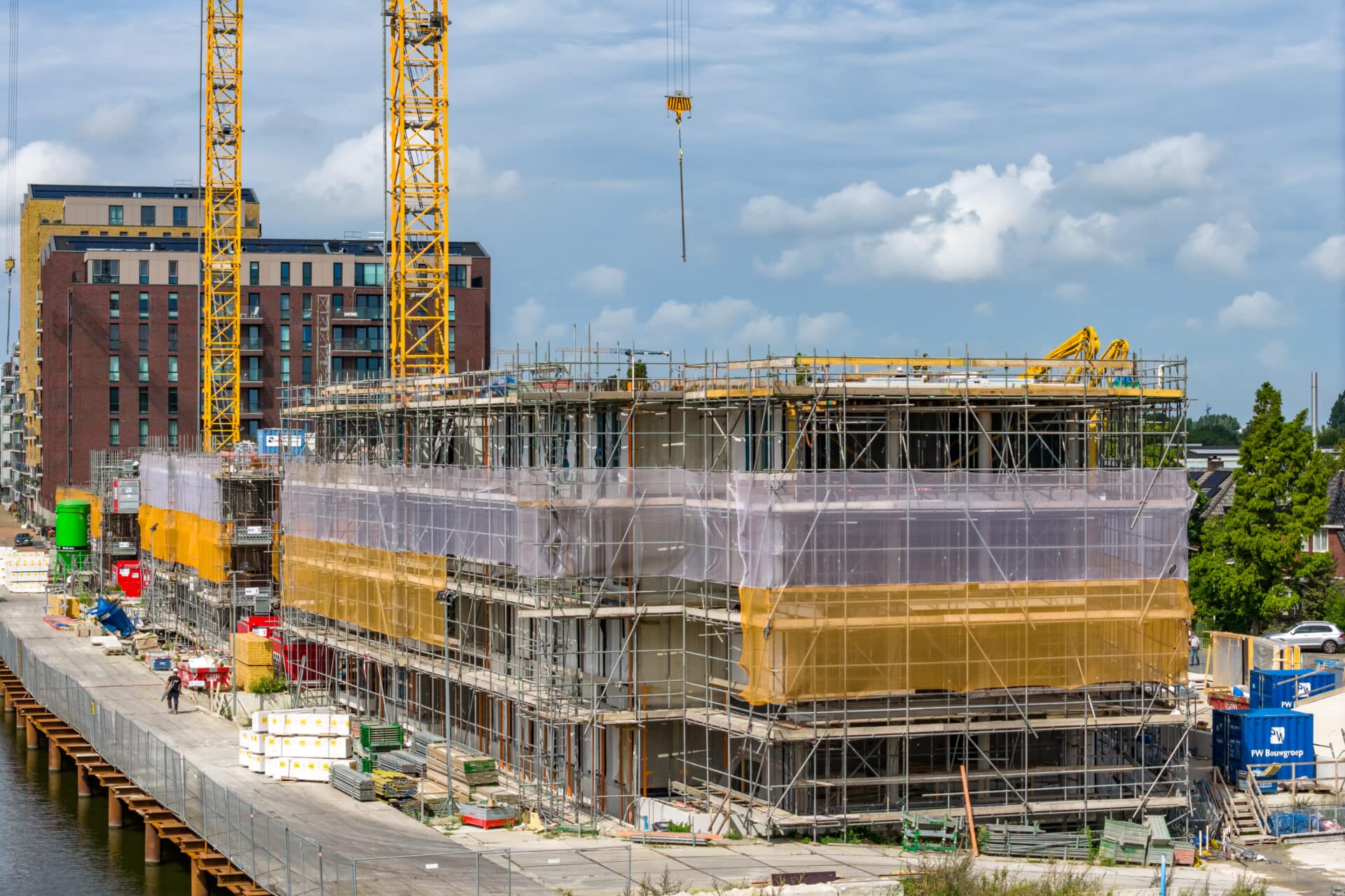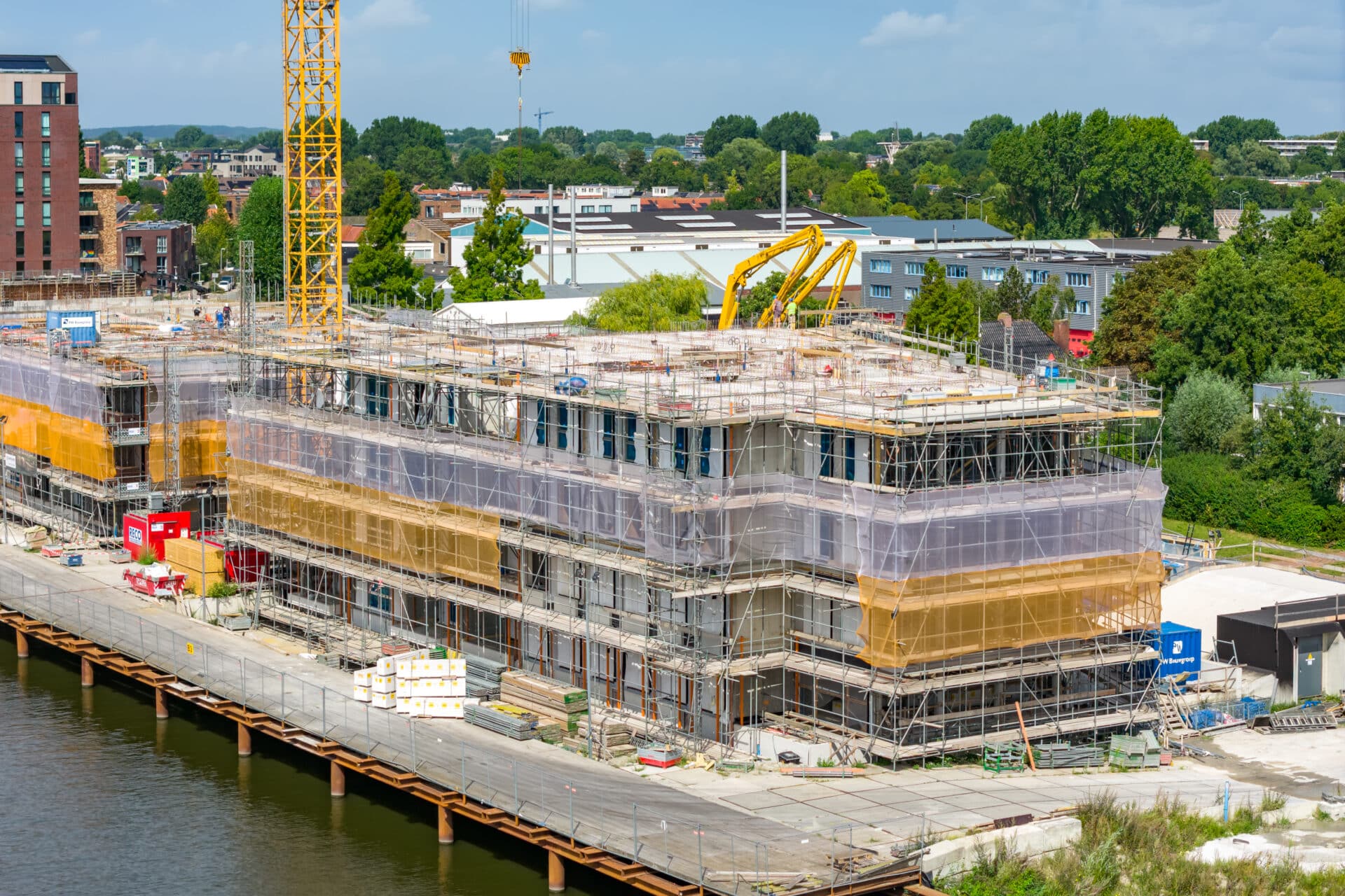 De betonwanden op de 2e verdiepingsvloer 1B1 worden gestort. De breedplaatvloer van de 3e verdieping wordt in week 37 gelegd.